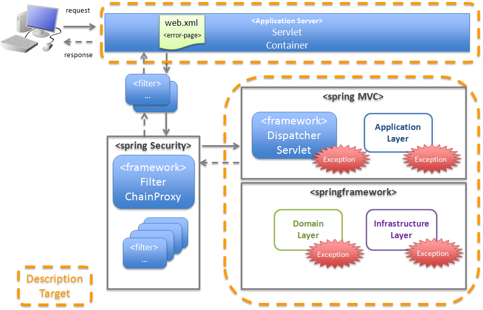 이 방법은 필터에서 발생하는 예외를 DispatcherServlet의 예외 처리기인