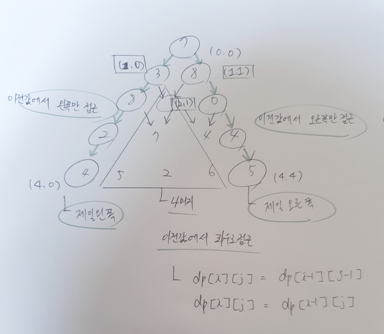 - 삼각형 triangle[i][j]→ i : 상하 위치 값 / j: 좌우 기준 위치 값