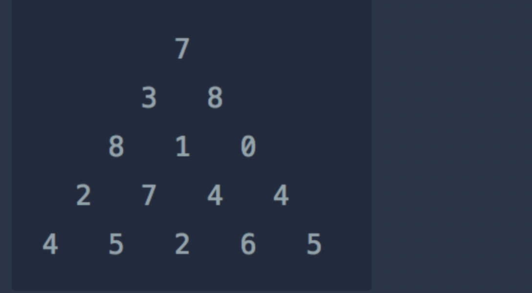 - [[7], [3, 8], [8, 1, 0], [2, 7, 4, 4], [4, 5, 2, 6, 5]]
