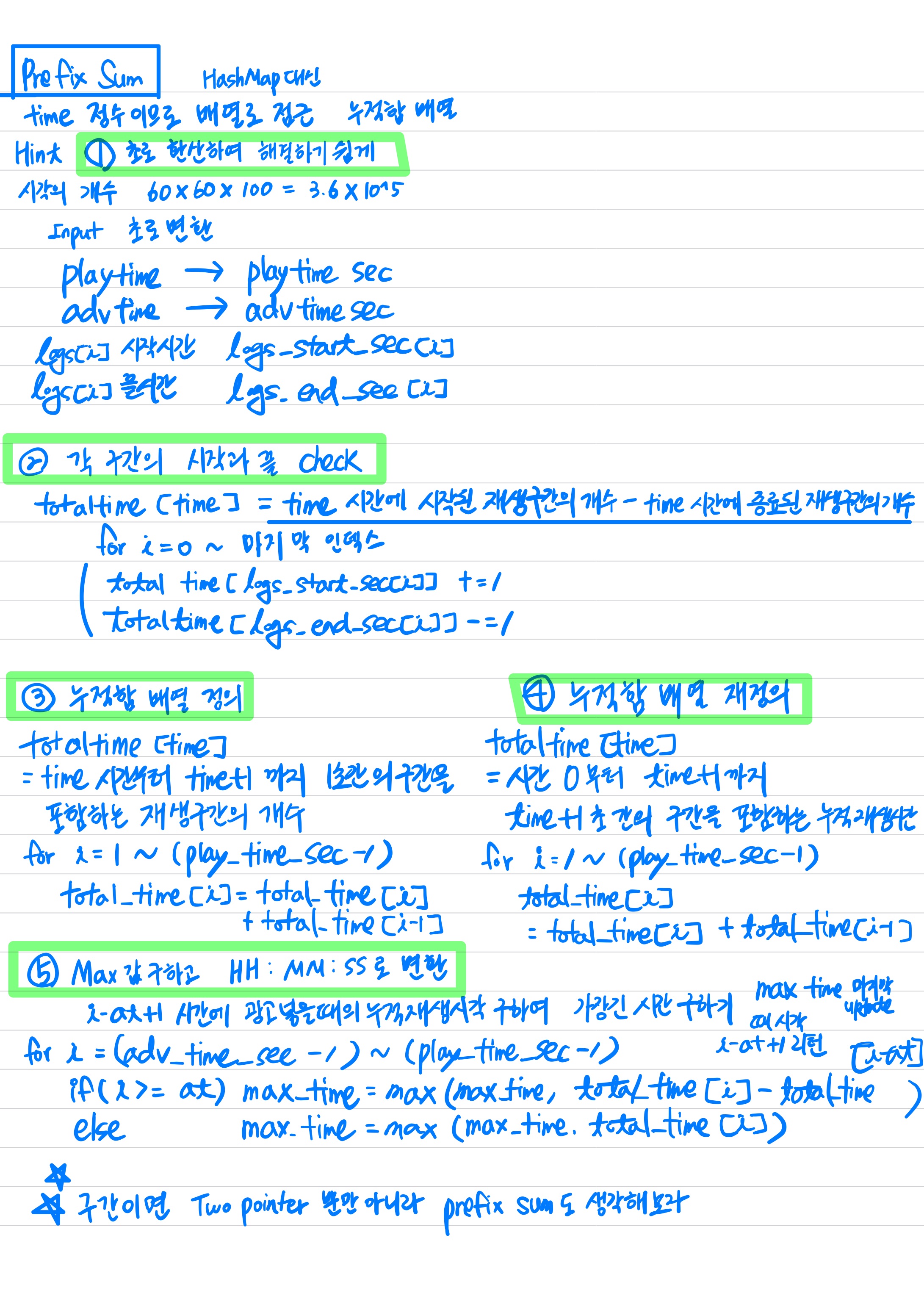 - 시청자들의 누적 재생시간을 구해주는 문제다. 누적 재생시간을 구하기 위해서 누적합을 활용하는데, 한번에 누적합 배열이 구해지지 않아서, 이 접근을 제외시켰다. 한번에 누적합 배열이 구해지지 않는다고 해서, 접근을 못하는 것이 아니다.