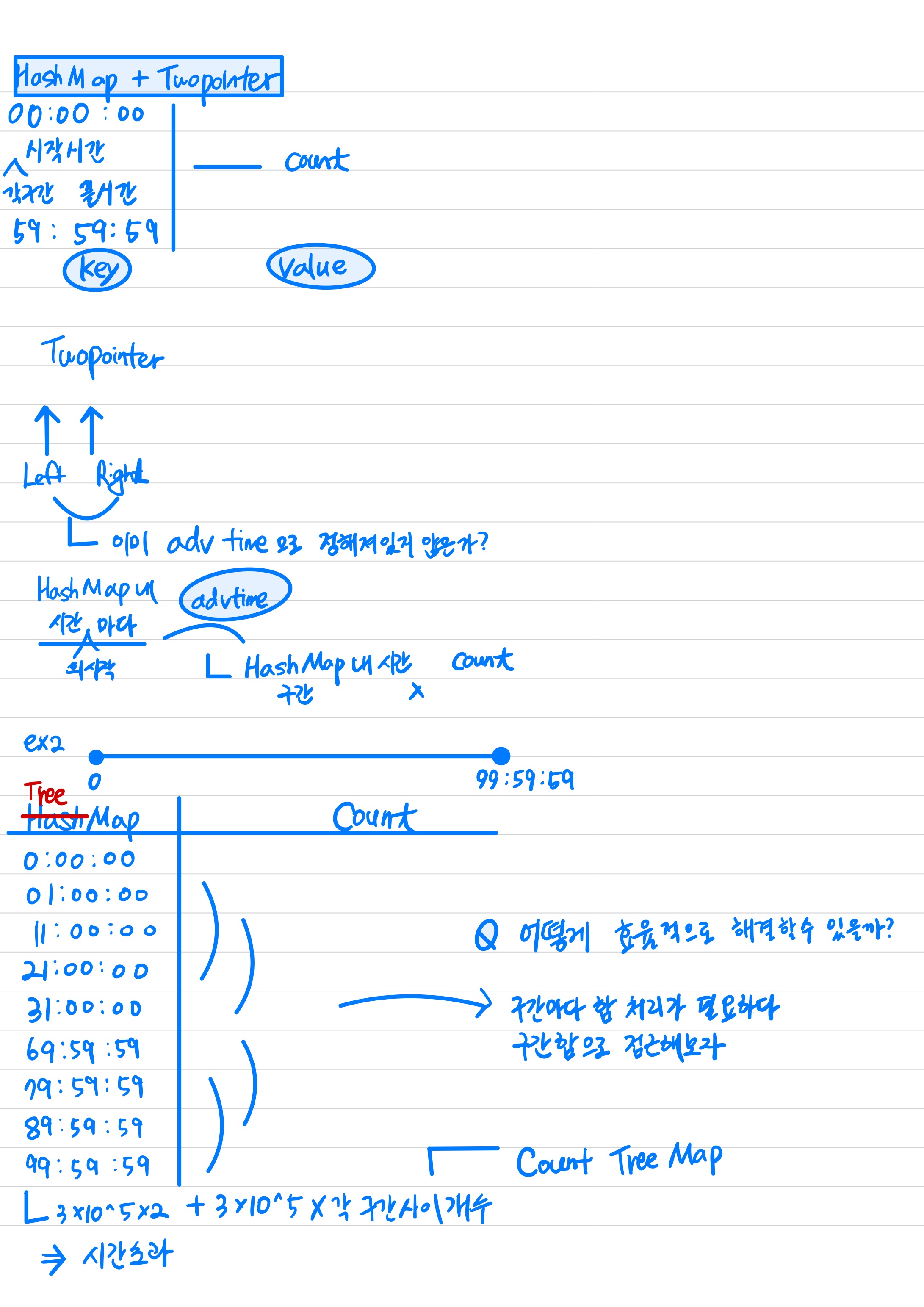 구간의 첫시간, 끝시간 대한 count Map 만드는데도 시간초과가 난다.