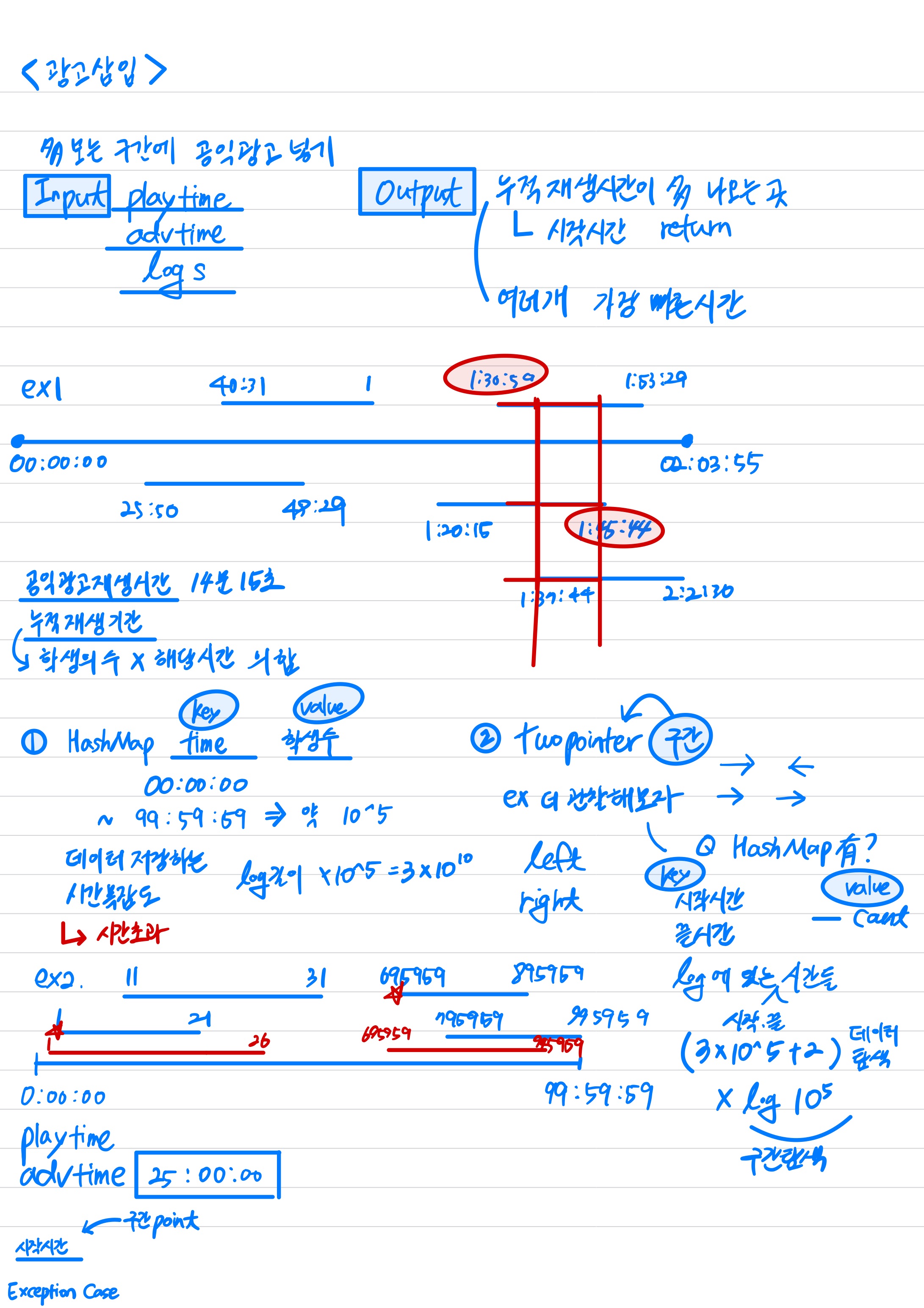 "죠르디"의 동영상 재생시간 길이 play_time, 공익광고의 재생시간 길이 adv_time, 시청자들이 해당 동영상을 재생했던 구간 정보 logs가 매개변수로 주어질 때, 시청자들의 누적 재생시간이 가장 많이 나오는 곳에 공익광고를 삽입하려고 합니다. 이때, 공익광고가 들어갈 시작 시각을 구해서 return 하도록 solution 함수를 완성해주세요. 만약, 시청자들의 누적 재생시간이 가장 많은 곳이 여러 곳이라면, 그 중에서 가장 빠른 시작 시각을 return 하도록 합니다.