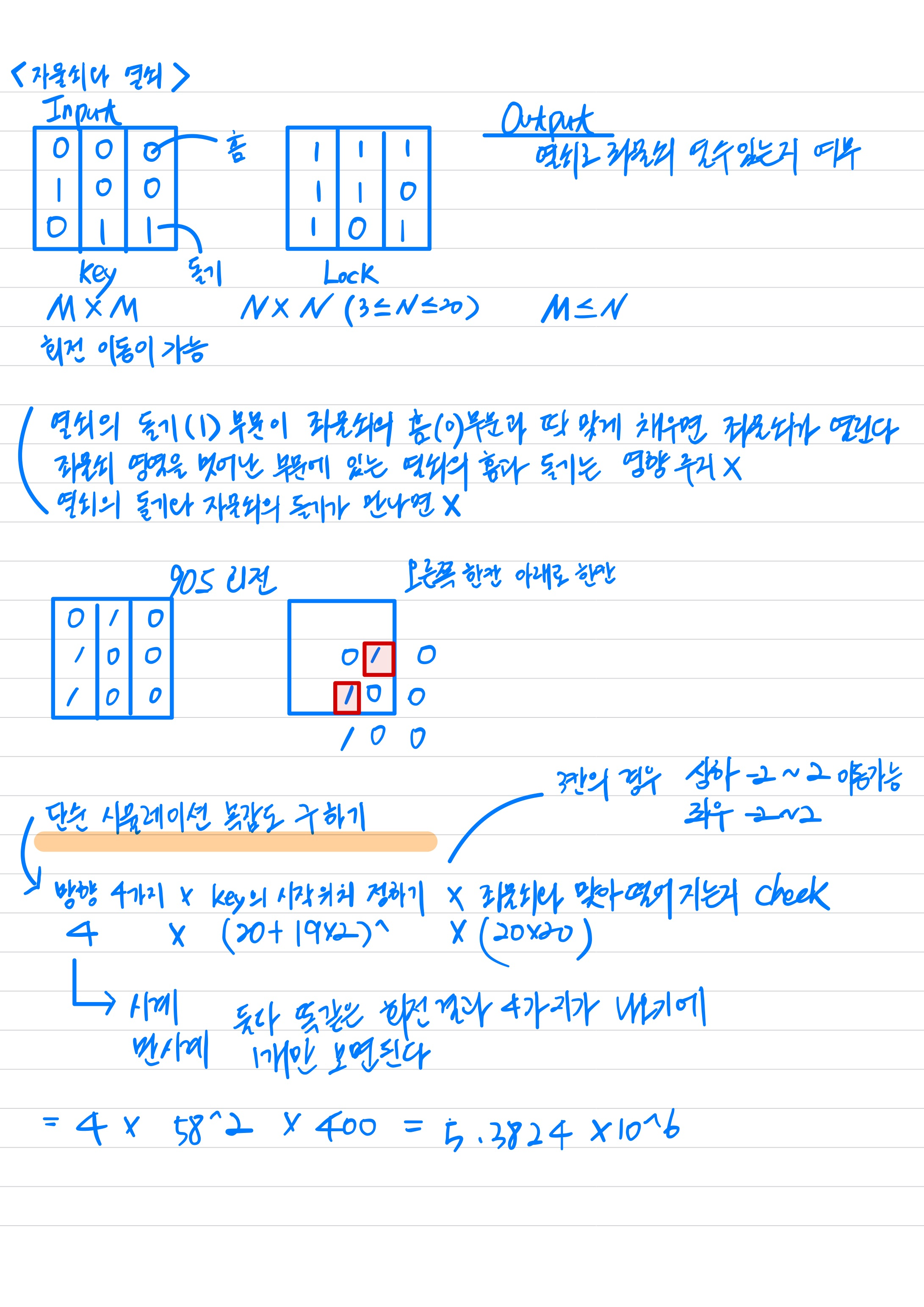 잠겨있는 자물쇠는 격자 한 칸의 크기가 1 x 1인 N x N 크기의 정사각 격자 형태이고 특이한 모양의 열쇠는 M x M 크기인 정사각 격자 형태로 되어 있습니다.