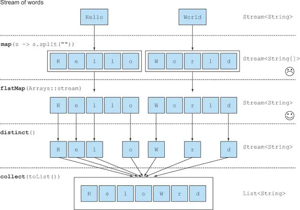 - Arrays.stream(T[] array)를 사용해 ["H", "e", "l", "l", "o"] 와 ["W", "o", "r", "l", "d"]를 각각 Stream으로 만든다.