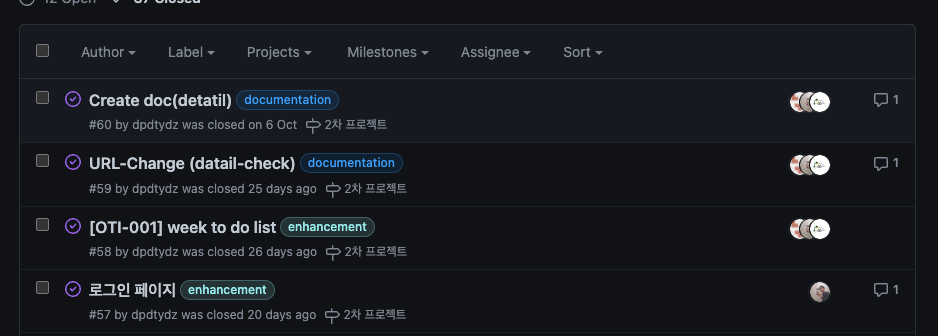 - 각 이슈를 배당한뒤 개인별 진행과정을 Project 칸반 보드를 통해서 확인하기 쉽게 만들었다.