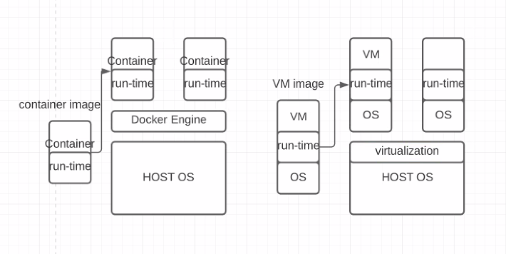 - flask app 올리기 위해, 100MB (Container Image) vs 10GB (Virtual image) 에서 배포해서 관리하는 것은 performance 차이가 난다.