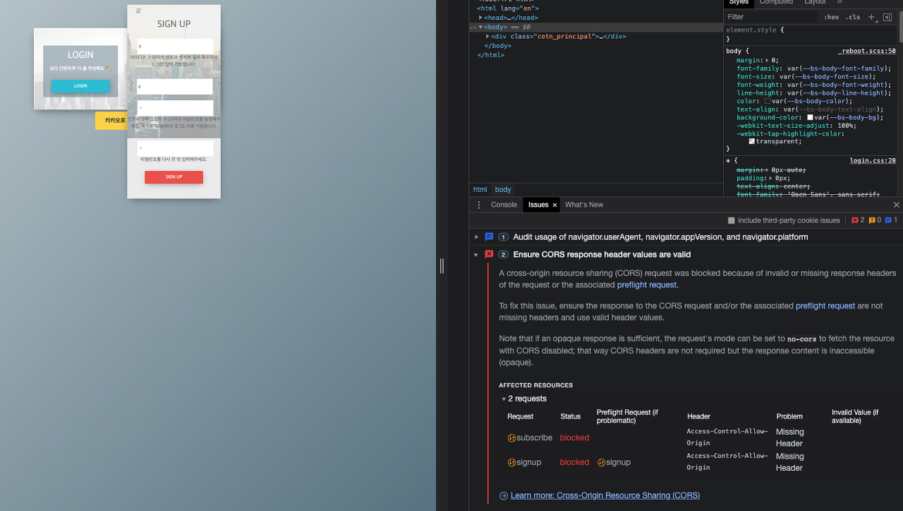 처음 CORS에러 뜨는 것을 보고, CORS를 잘못 설정해두었다고 착각하여 관련 파일을 수정했었다.