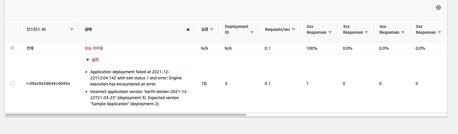 EB의 상태를 확인해보니, Application version이 Expected version이 아니여서 failled가 되었다.