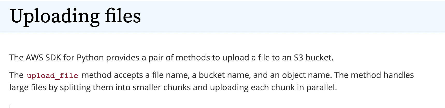 Uploading files The AWS SDK for Python provides a pair of methods to upload a file to an S3 bucket. The upload_file method accepts a file name, a bucket name, and an object name. The method handles large files by splitting them into smaller chunks and uplo