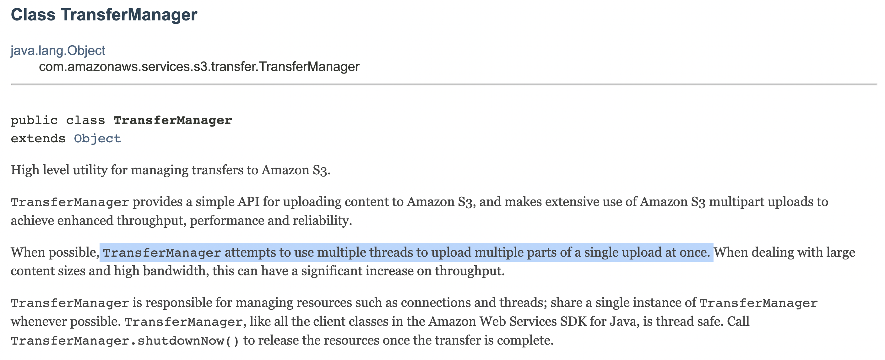 TransferManager 라이브러리는 multiple threads를 사용하여, MultiPart 파일을 업로드 한다고 한다.